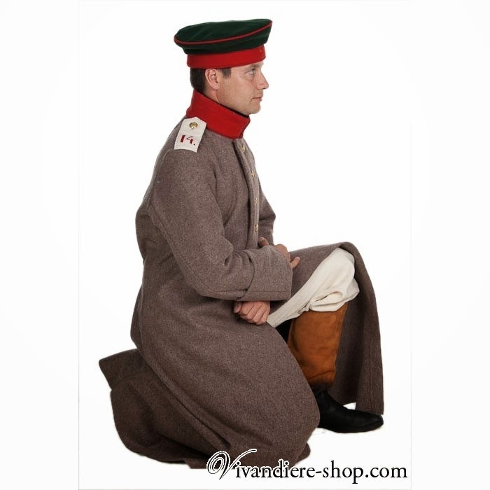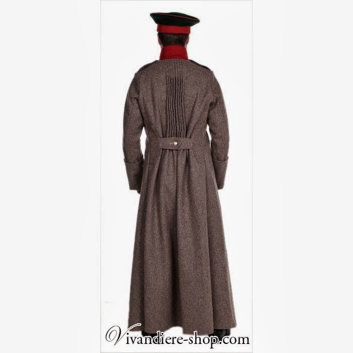Особенности конструкции: Шинель изготовлена из серого некрашеного сукна, по плотности и фактуре соответствующего оригинальным образцам. Подкладка выполнена из некрашенного льняного полотна. Шинель поставляется в полностью готовом виде, с пришитыми погонами, крючками, пуговицами. В комплект входят 7 кожаных петель и 7 кожаных пуговиц (предназначены для подворачивания пол шинели), а также поясная утяжка из льняной тесьмы с кожаной пуговицей - эти детали требуют индивидуальной подгонки при установке. ...